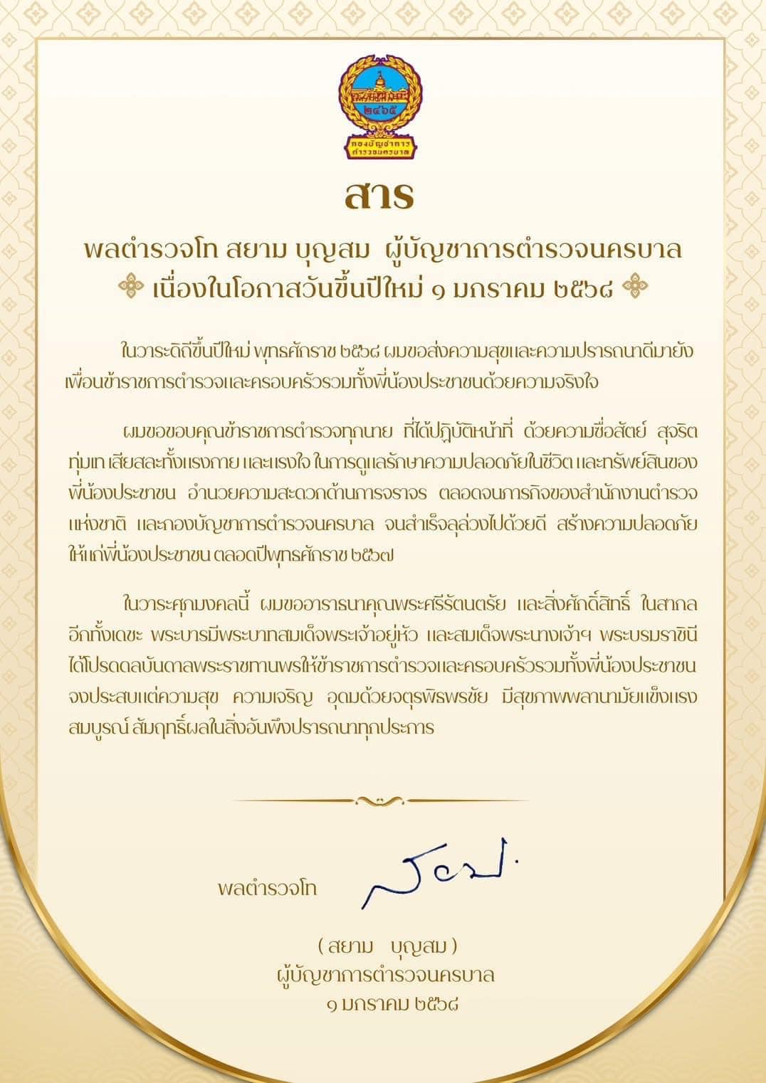 “ในวาระดิถีขึ้นปีใหม่ พุทธศักราช 2568 ผมขอส่งความสุขและความปรารถนาดีมายังเพื่อนข้าราชการตำรวจและครอบครัว รวมทั้งพี่น้องประชาชนด้วยความจริงใจ
