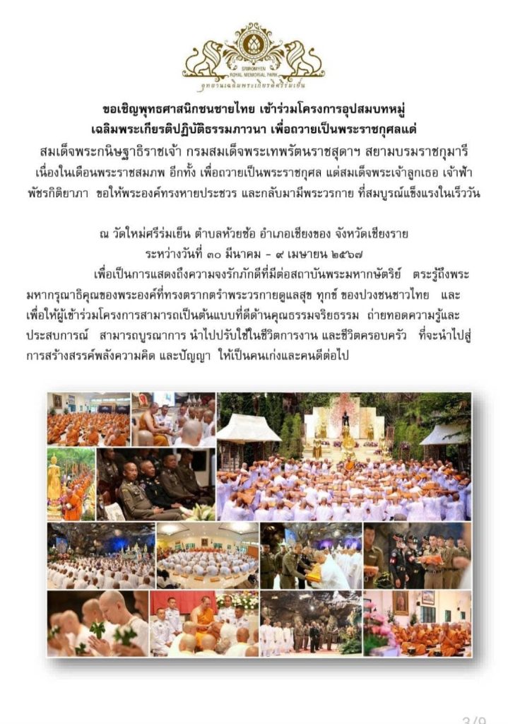 ณ วัดใหม่ศรีร่มเย็น ต.ห้วยซ้อ อ.เชียงของ จว.เชียงราย ระหว่างวันที่ 30 มีนาคม – 9 เมษายน 2567