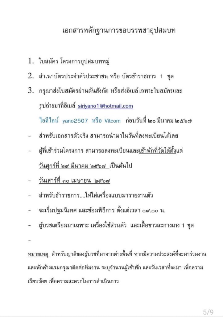 สำหรับผู้ที่สนใจเข้าร่วมโครงการอุปสมบทหมู่เฉลิมพระเกียรติ กรุณาส่งใบสมัครผ่านต้นสังกัด หรือส่งอีเมล เฉพาะใบสมคัรและรูปถ่ายมาที่อีเมล siriyano1@hotmail.com หรือไอดีไลน์ yano2507 หรือ Vitcom ก่อนวันที่ 20 มีนาคม 2567