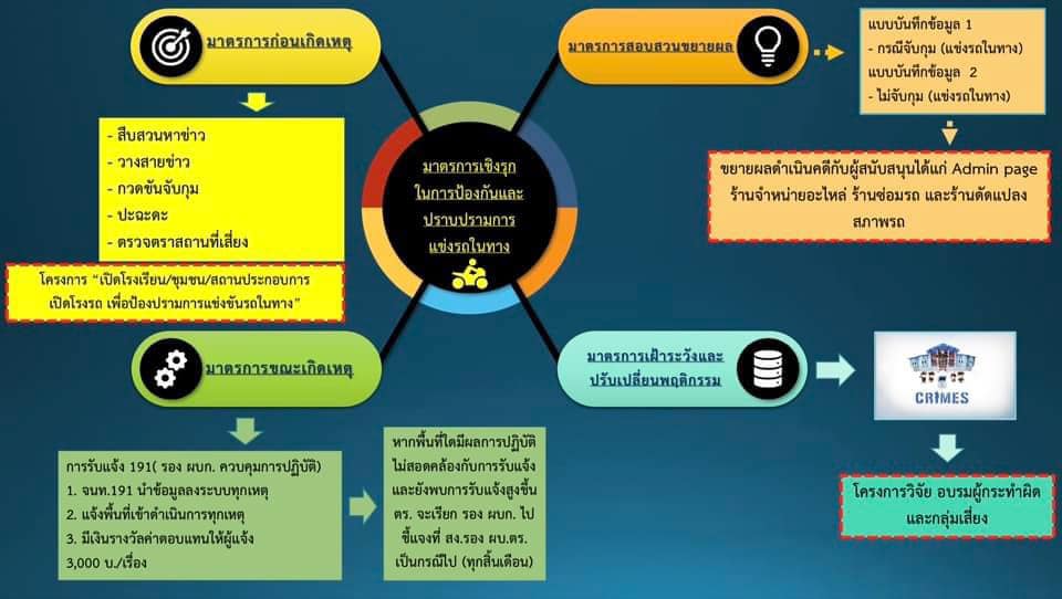 – บันทึกข้อมูลกลุ่มเสี่ยงต่อการแข่งรถในทางในทุกพื้นที่ทั่วประเทศ ไว้ในระบบ CRIME อย่างเป็นระบบ